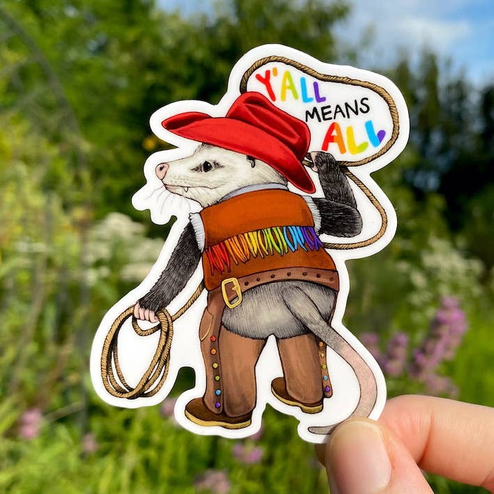 This sticker features my illustration of an opossum cowhand showing off their lassoing skills and rainbow-fringed duds! The hand-lettered phrase “Y’all Means All” is written inside of their lasso, signaling their commitment to inclusion and acceptance for all.