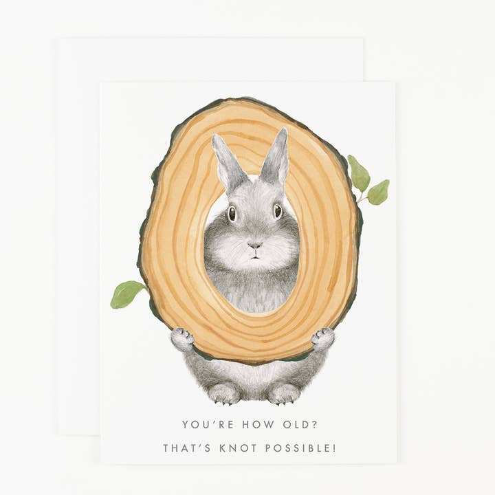 A graphite Bunny with a hand painted tree knot text reads “You're how old? That's Knot Possible!”